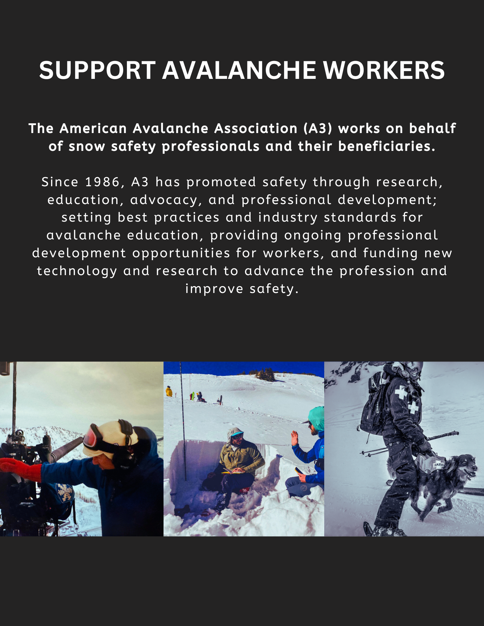 Help A3 support the men and women who keep us safe, informed, and educated in avalanche country. Your donations will enable us to fund new research and innovations in safety and mitigation, support mental health training for practitioners, and advocate for the continuation of avalanche forecasting programs in the US.